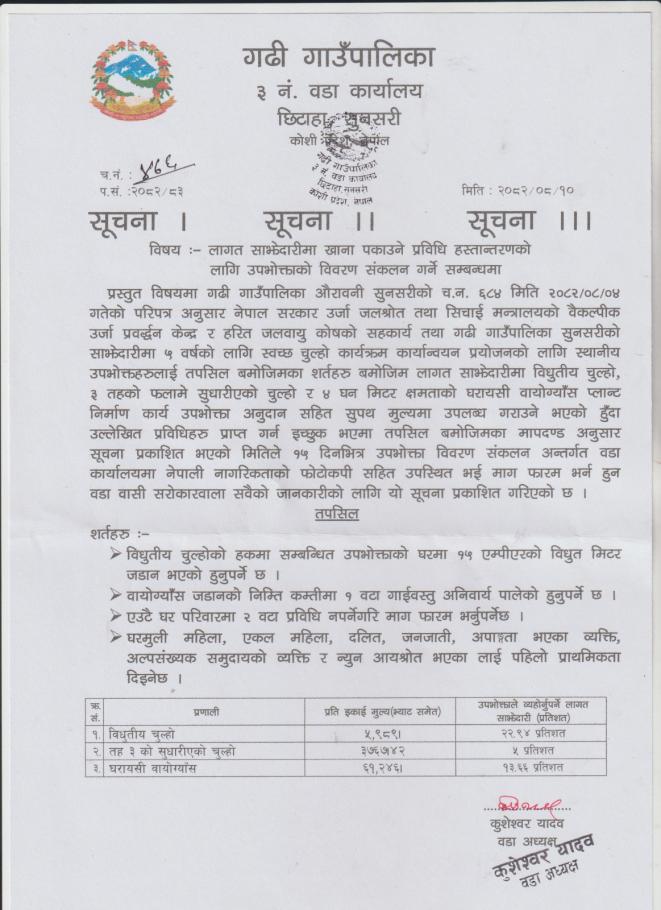 » लागत साझेदारीमा खाना पकाउने प्रविधि हस्तान्तरणको लागि उपभोक्ताको विवरण संकलन गर्ने सम्बन्धी सूचना ।