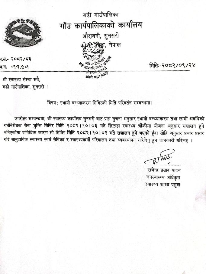 » स्थायी बन्ध्याकरण सिविरको मिति परिवर्तन सम्बन्धमा ।