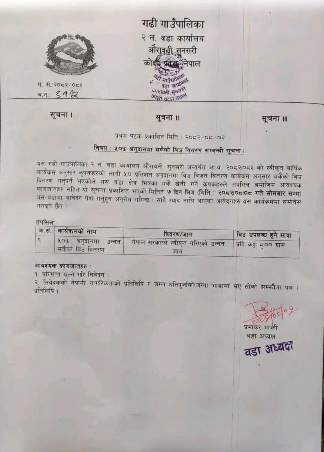 ५०% अनुदानमा मकैको बिउ वितरण सम्बन्धी सूचना ।