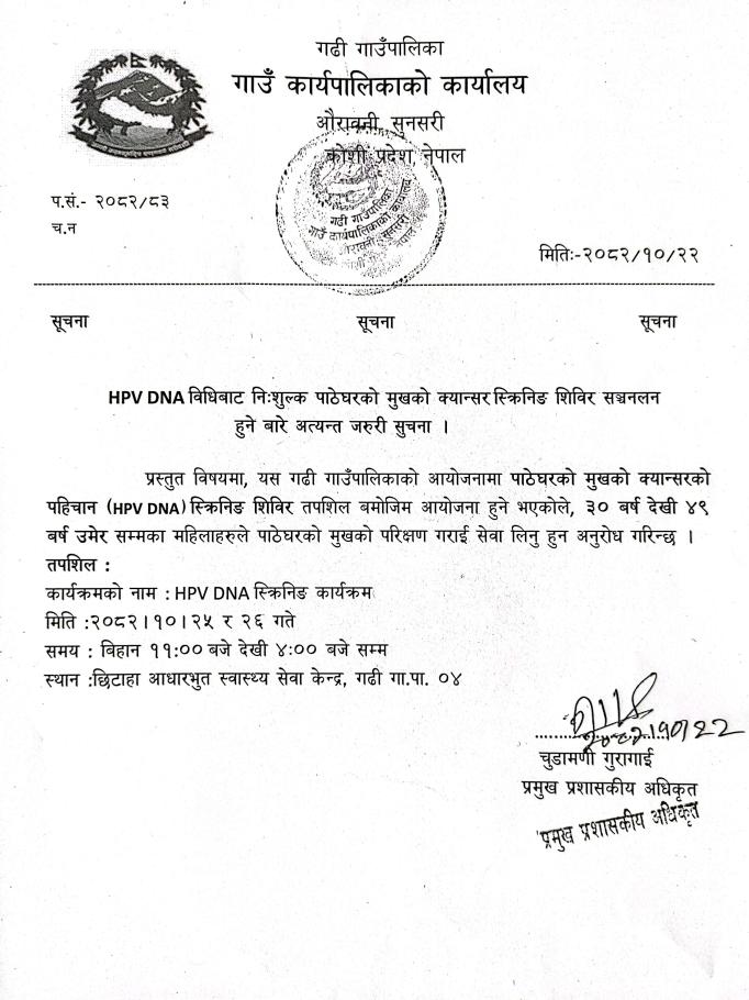 HPV DNA विधिबाट नि: शुल्क पाठेघरको मुखको क्यान्सर स्क्रिनिङ शिविर सञ्चालन हुने बारे अत्यन्त जरुरी सूचना ।