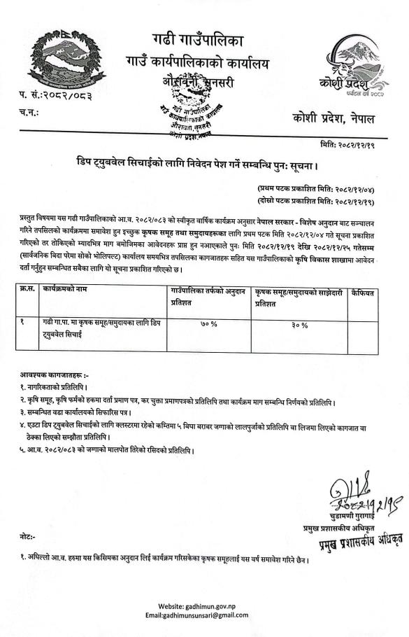 डिप ट्युबवेल सिचाईको लागि निवेदन पेश गर्ने सम्बन्धी पुनः सूचना ।