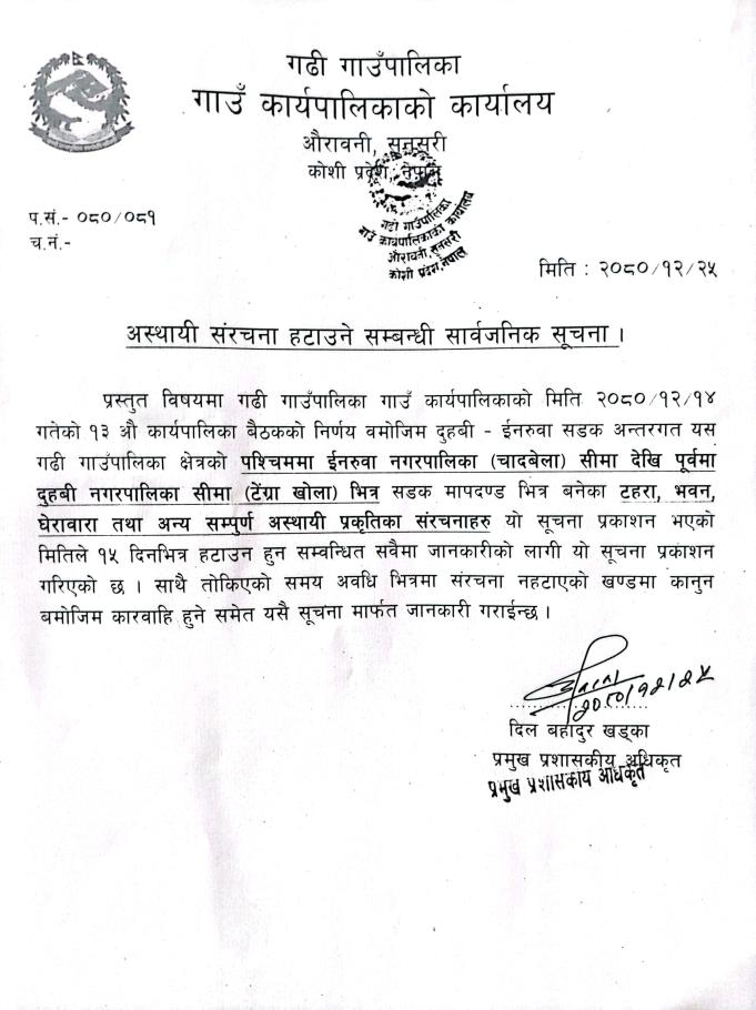 अस्थायी संरचना हटाउने सम्बन्धी सार्वजनिक सूचना।