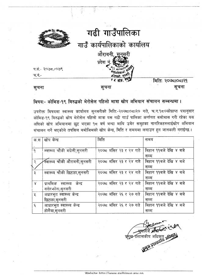 कोभिड – १९ विरुद्धको भेरोसेल पहिलो मात्रा खोप अभियान संचालन सम्बन्धी सूचना |