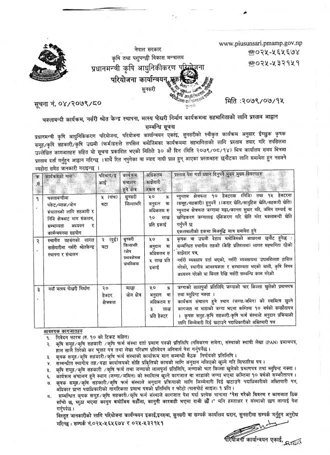 चक्लाबन्दी कार्यक्रम,नर्सरी श्रोत केन्द्र स्थापना, मत्स्य पोखरी निर्माण कार्यक्रममा सहभागिताको लागि प्रस्ताव आव्हान सम्बन्धी सूचना |