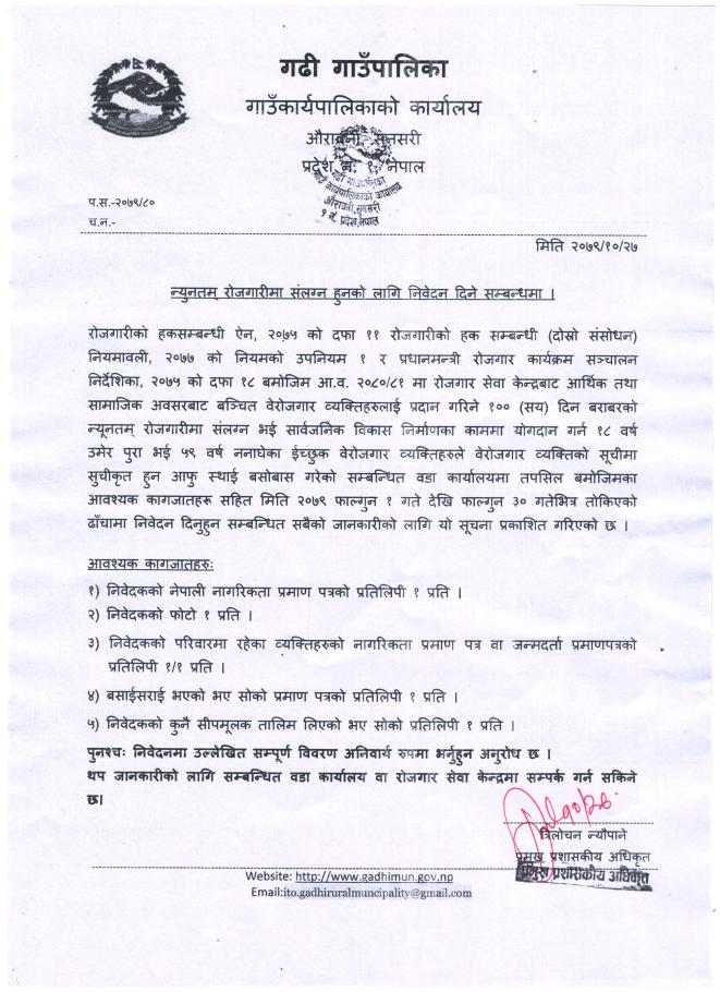 न्युनतम रोजगारीमा संलग्न हुनको लागि निवेदन दिने सम्बन्धी सूचना |