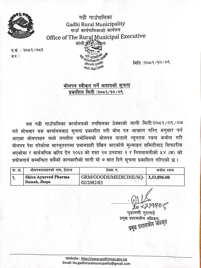 » बोलपत्र स्वीकृत गर्ने आशयको सूचना ।