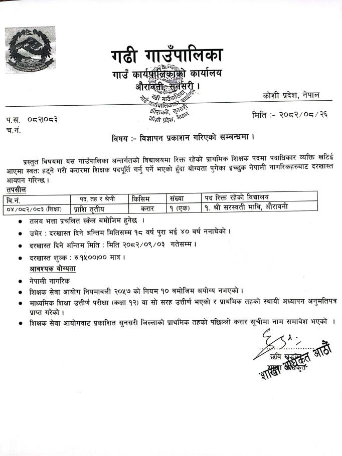 विज्ञापन प्रकाशन गरिएकाे सम्बन्धी सूचना ।