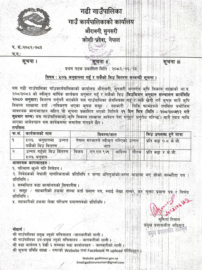 ५०% अनुदानमा गहुँ र मकैको बिउ वितरण सम्बन्धी सूचना ।