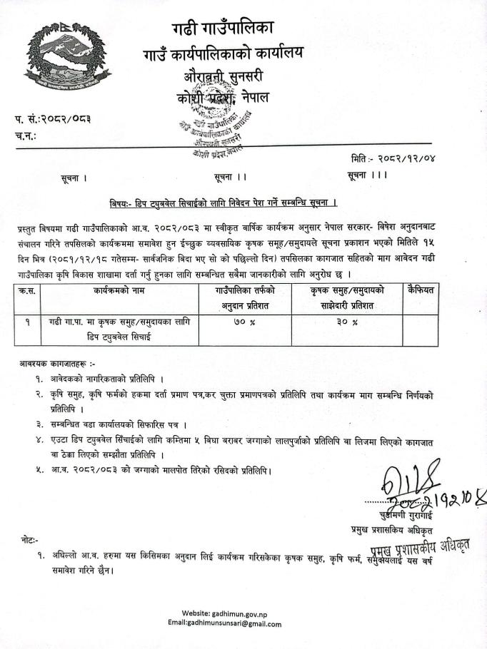 डिप ट्युबवेल सिचाईको लागि निवेदन पेश गर्ने सम्बन्धी सूचना ।