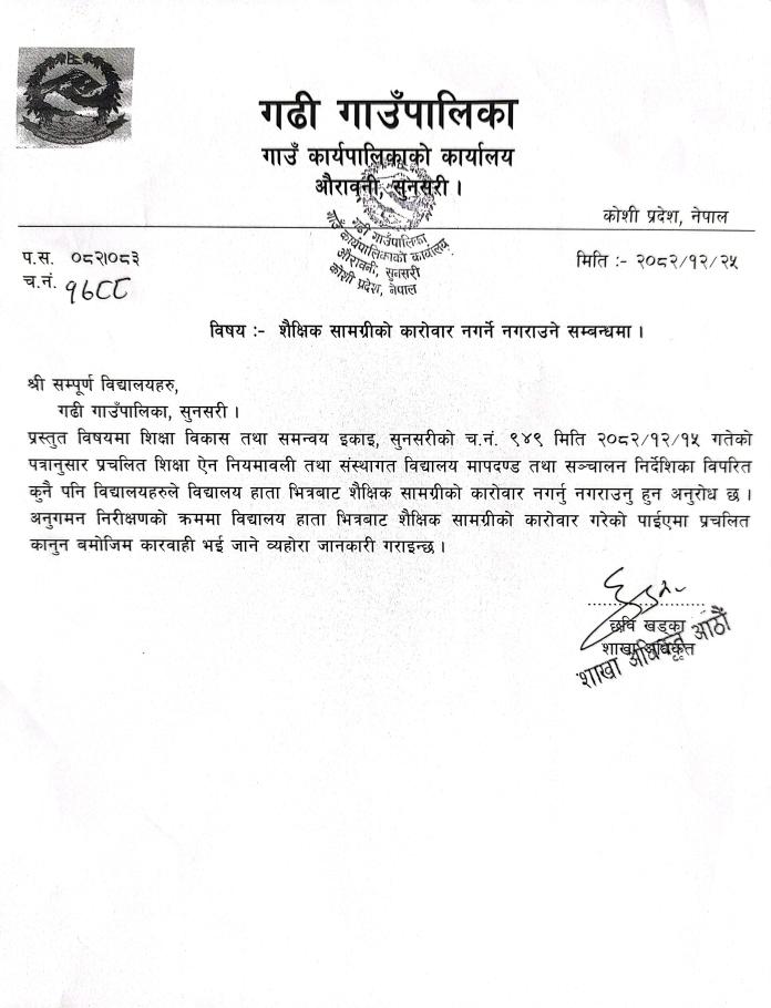 शैक्षिक सामग्रीको कारोवार नगर्ने नगराउने सम्बन्धमा ।