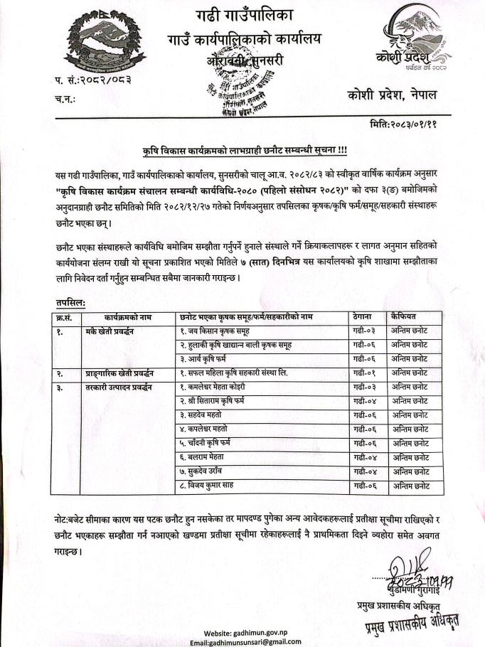 कृषि विकास कार्यक्रमको लाभग्राही छनौट सम्बन्धी सूचना ।
